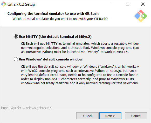 Select the terminal emulator. On a Windows 8.1 (or Server 2012 R2) or earlier system, leave the default selection (MinTTY).
